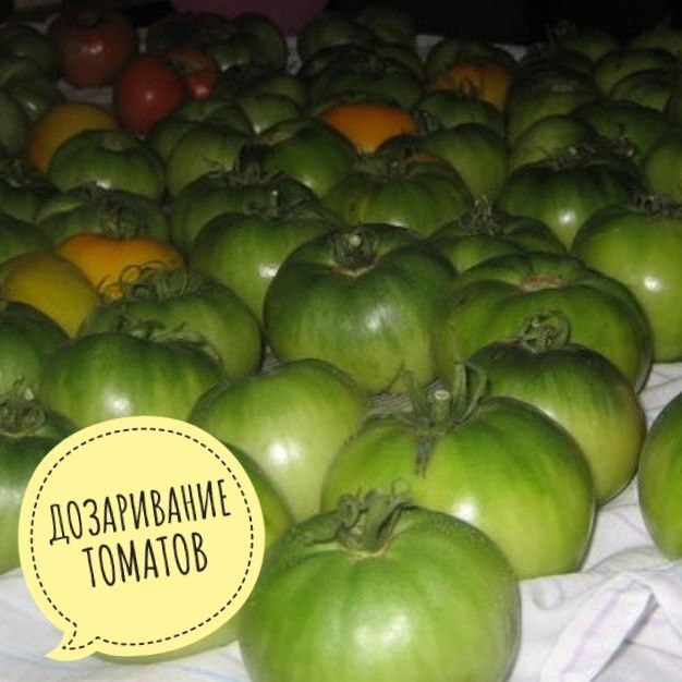 Для быстрого дозаривания томаты укладывают в ящики не более чем в 2 слоя и держат при температуре +18…+23°С и относительной влажности воздуха 70—80% в хорошо проветриваемом помещении. Вместе с зелеными плодами можно положить в каждый ящик по несколько зрелых (красных), которые выделяя этилен, способствуют ускоренному созреванию первых.